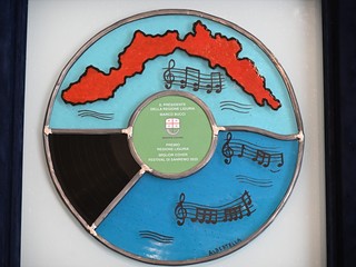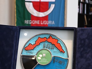 Si tratta di un vetro artistico dipinto a mano che rappresenta un vinile 33 giri, nella cui parte superiore è raffigurato il profilo della Liguria immerso nel mare, mentre in quella inferiore alcune onde si trasformano in pentagrammi. Si tratta di spartiti musicali che riportano le prime note di tre canzoni che hanno avuto grande successo e sono rimaste nella memoria collettiva: 'Terra promessa' di Eros Ramazzotti del 1984, 'Il mare calmo della sera' di Andrea Bocelli del 1994 e 'Soldi di Mahmood' del 2019.