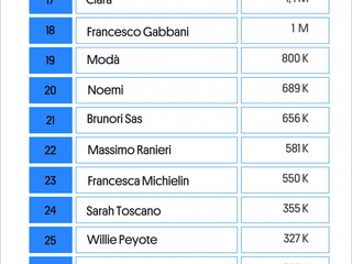 Nella parte centrale della classifica spiccano Fedez, sempre capace di unire musica e attualità, e Irama, punto di riferimento per il pop contemporaneo. Troviamo anche i Coma_Cose, che con il loro stile unico continuano a catturare l’attenzione di un pubblico giovane e attento alle nuove tendenze. Tra gli artisti più longevi abbiamo poi Brunori Sas e Giorgia che confermano la loro capacità di attraversare le generazioni con autenticità e talento. Tra le sorprese di questa edizione c’è invece Clara, una nuova voce del pop che, con i suoi 1.429.181 ascoltatori mensili, supera artisti affermati come Francesco Gabbani e Noemi.