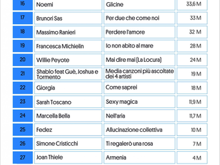 La seconda parte della classifica è invece caratterizzata da un mix tra cantanti di tendenza e autori più classici. Con oltre 10 milioni di ascolti troviamo i successi, tra gli altri, di Fedez (Allucinazione collettiva), Massimo Ranieri (Perdere l’amore), Francesca Michielin (Io non abito al mare), Giorgia (Come saprei) e del quartetto capitanato da Guè. Sono infine solo 4 le canzoni a restare sotto i 10 milioni di ascolti, appartenenti ad artisti come Simone Cristicchi, Joan Thiele, Serena Brancale, Lucio Corsi e Olly.