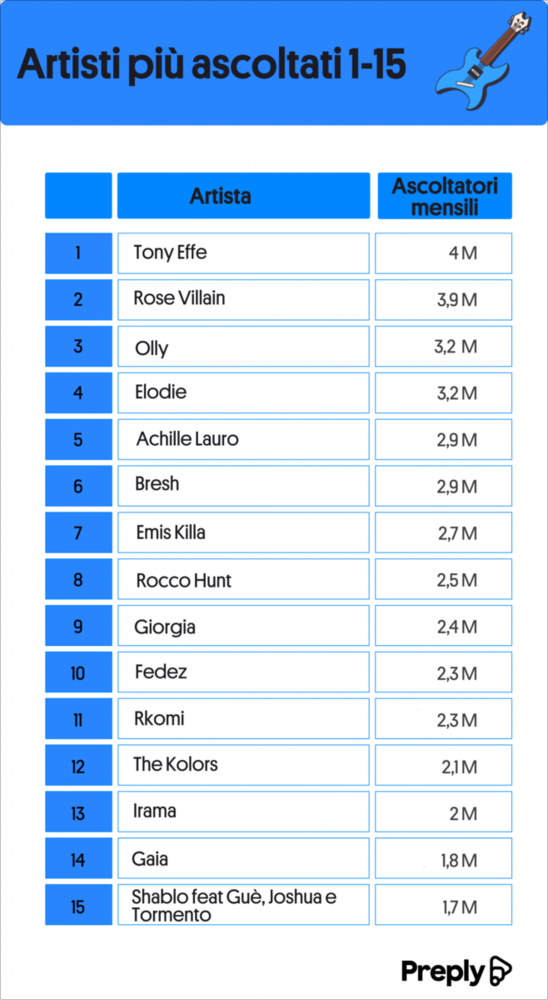 Colpisce come alcune delle canzoni nella prima parte di questa classifica come Mediterranea, Click Boom!, Viceversa, Fiamme negli occhi, Mai dire mai, sono tutte canzoni lanciate da Sanremo dimostrando l’enorme impatto del Festival anche sulle classifiche di streaming e nel lanciare gli artisti.