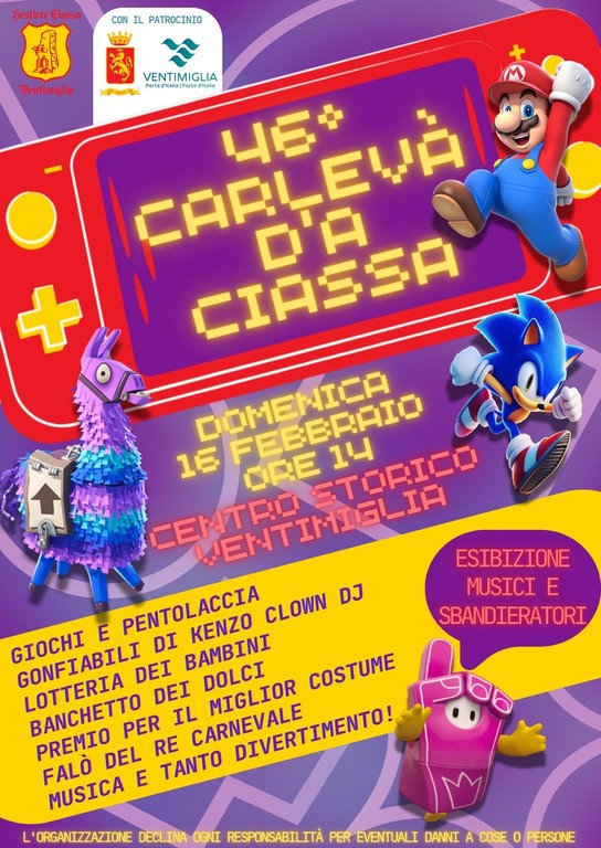 Il Carnevale verrà, come da tradizione, organizzato dal Sestiere Ciassa e patrocinato dal Comune di Ventimiglia.