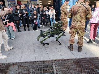 Il modello dimostrativo delle forze armate ha attirato l'attenzione dei presenti, che hanno creato molti capannelli per fotografare e filmare il cane hi-tech