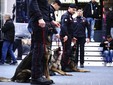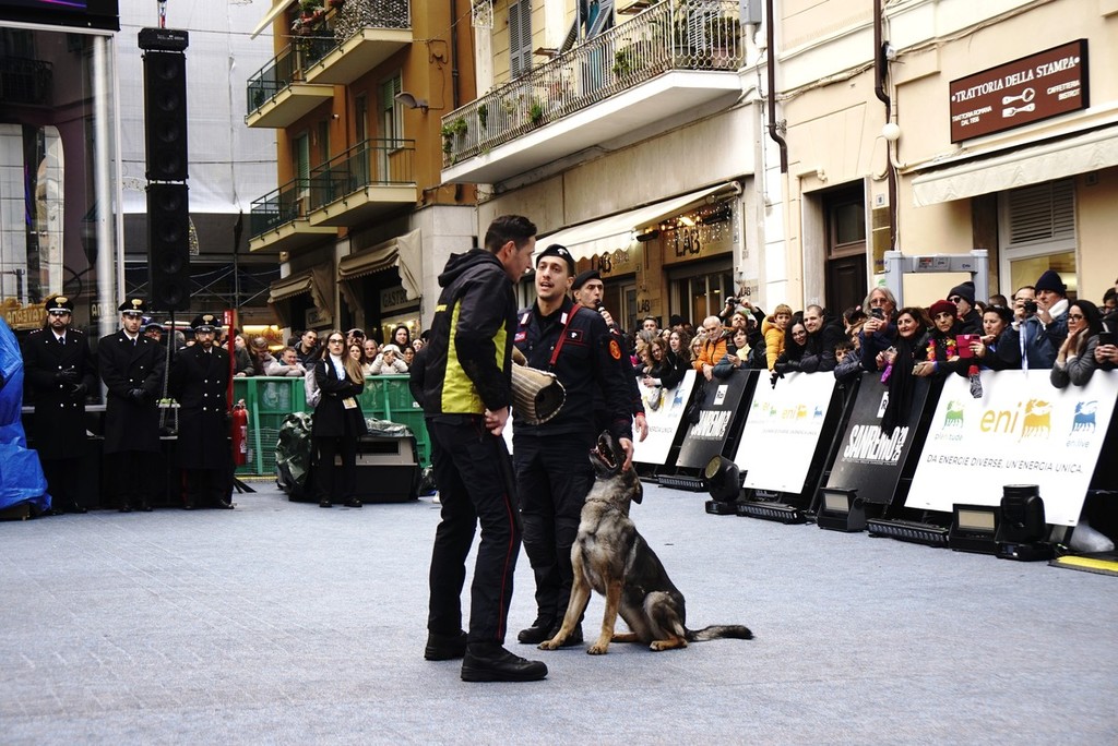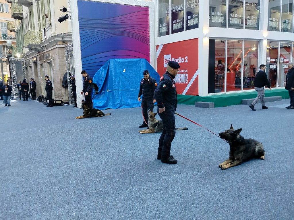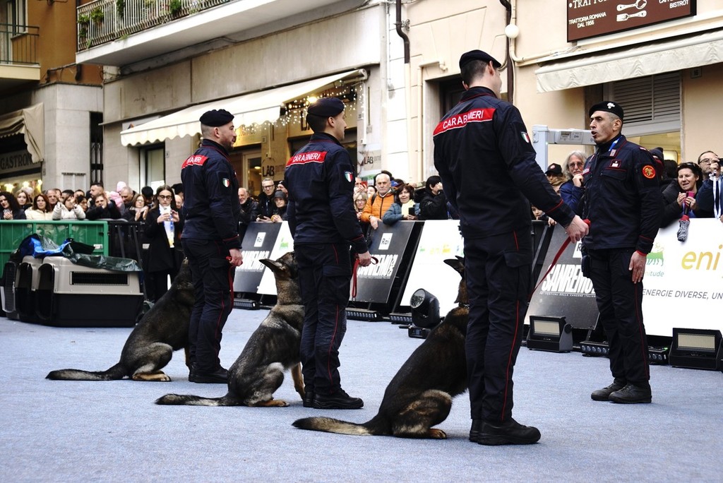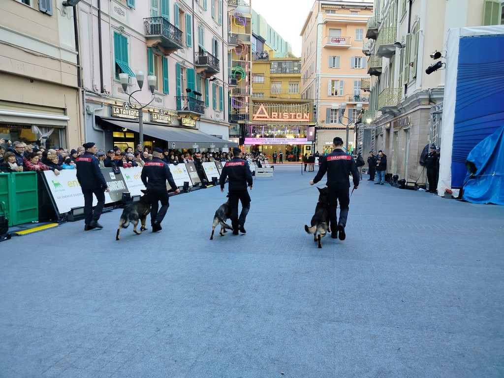 I Carabinieri dell'unità cinofila di Firenze hanno offerto a Sanremo un'esibizione di alcuni esemplari della loro squadra, di fronte al teatro Ariston, alla vigilia dell'attesissima finale del Festival della canzone italiana.