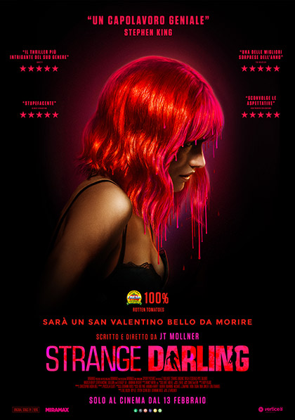 - STRANGE DARLING – ore 21.15 – di JT Mollner. Un film Da vedere 2023 con Willa Fitzgerald, Kyle Gallner, Madisen Beaty, Steven Michael Quezada, Ed Begley Jr. - Thriller/Horror – “Una giovane donna vestita di rosso corre nel bosco. Si tiene la mano su un orecchio insanguinato e si nasconde nella vegetazione, da un uomo armato di fucile che è sulle sue tracce. Trova fortunosamente una bottiglia di vodka e la usa per disinfettare la ferita, trattenendo a stento le urla di dolore. Poco più in là c'è una casa isolata, nel mezzo del bosco, ma sarà abitata? E chi la abita l'aiuterà? La notte prima la donna e il suo inseguitore si sono conosciuti in un locale, hanno parlato a lungo in macchina, dei rischi per una donna nell'entrare in una relazione e poi si sono dati a giochi sessuali BDSM in un motel. Come si è arrivati da quella situazione intima e questo inseguimento disperato?...”