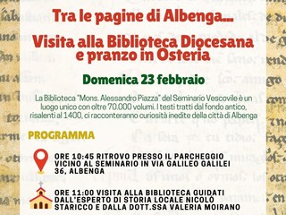 L'Osteria del Tempo Stretto vi invita a un'esperienza unica, un connubio tra storia e gastronomia nel cuore di Albenga. Domenica 23 febbraio, immergetevi nelle pagine del passato con una visita esclusiva alla Biblioteca Diocesana "Mons. Alessandro Piazza", scrigno di oltre 70.000 volumi, tra cui preziose testimonianze del 1400. A seguire un delizioso pranzo in Osteria!