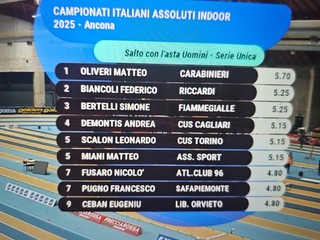 Il giovane atleta del centro sportivo carabinieri, allenato a Sanremo da Mario Botto, ha raggiunto la prima posizione con 5.70 nella serie unica uomini dei campionati italiani assoluti indoor.