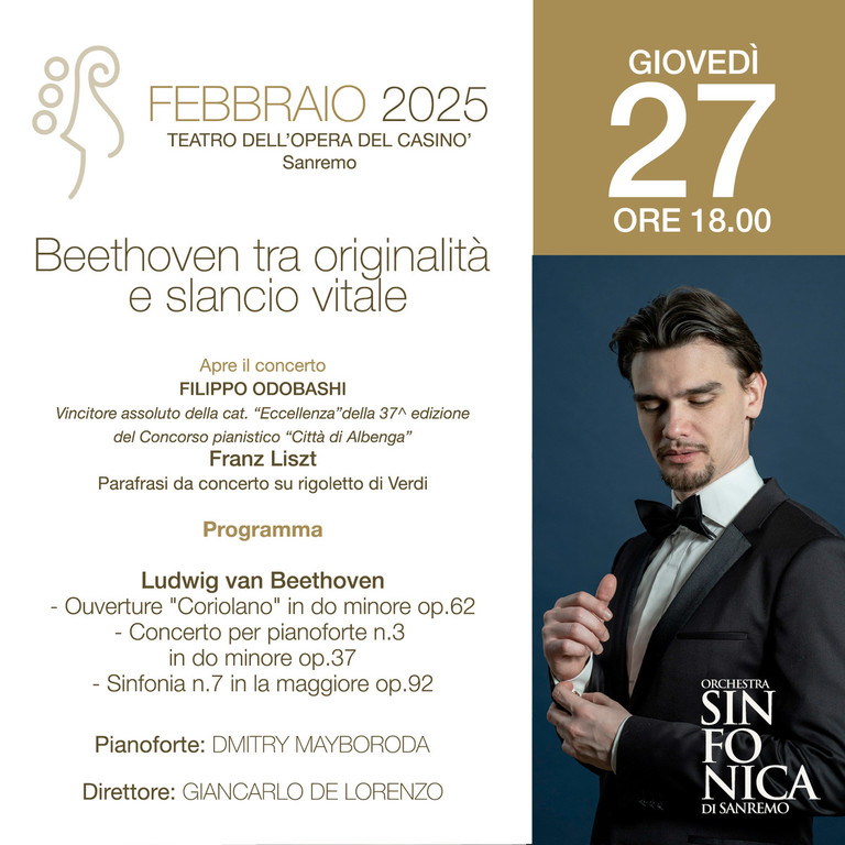 “Il concerto si aprirà con una sorpresa per la città” – racconta il M° Giancarlo De Lorenzo, direttore artistico della Fondazione - “abbiamo invitato il giovanissimo Filippo Odobashi, talento sanremese che ha recentemente vinto il 37° "Concorso Pianistico Città di Albenga", ad aprire la serata. Eseguirà per noi la "Parafrasi da concerto su Rigoletto" del compositore e virtuoso pianista Franz Liszt. Il Concerto per pianoforte e orchestra n.3 di Beethoven è invece affidato al talentuoso pianista russo Dmitry Mayboroda, finalista del concorso “Scriabin International Piano Competition 2024” e già vincitore di numerosi concorsi internazionali”.