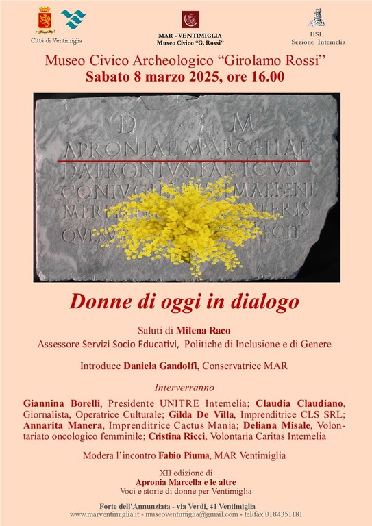 Sabato 8 marzo, in occasione della Festa delle Donne, il Museo Civico “Girolamo Rossi” in collaborazione col Comune di Ventimiglia e la Sezione Intemelia dell'IISL organizza l'evento “Apronia Marcella e le altre. Voci e storie di donne per Ventimiglia”, giunto quest'anno alla XII edizione.
