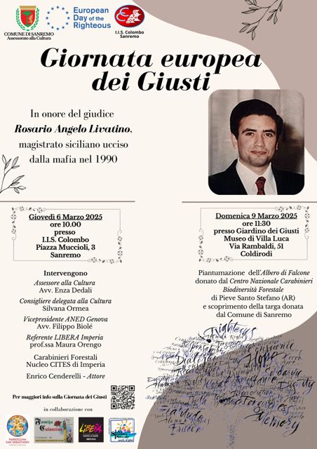 Domani (giovedì 6 marzo) all’istituto Colombo di Sanremo (aula Calvino) si terrà un interessante incontro organizzato dagli insegnanti e dagli studenti delle classi prime e seconde in occasione della “Giornata Europea dei Giusti”, istituita nel 2021 per ricordare l’esempio dei Giusti del passato e del presente e per diffondere i valori di responsabilità, tolleranza e solidarietà.