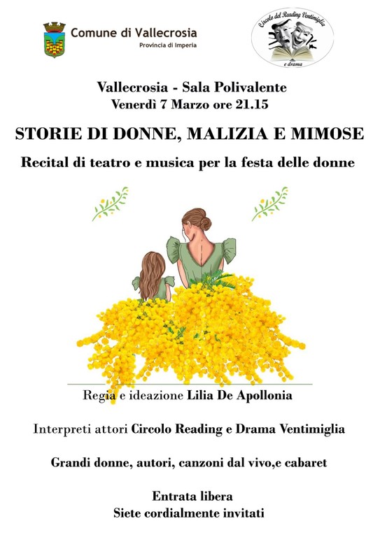 Venerdì sera Vallecrosia celebra la festa internazionale della donna con un recital teatrale, presso la sala polivalente del comune dell'estremo ponente ligure, con uno spettacolo teatral-musicale con 10 interpreti messo in scena dal circolo Reading e drama Ventimiglia dal titolo 'Storie di donne, malizia e mimose'.