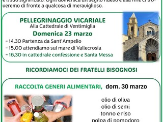 "Diverse saranno le iniziative proposte durante il periodo della Quaresima giubilare: tutti i venerdì alle 17 vi sarà la Via Crucis. Come segno quaresimale in fondo alla chiesa vi sarà un gozzo ligure. Man mano che percorriamo le domeniche di Quaresima sopra il gozzo ricomporremo il logo del giubileo e il suo significato. Ogni domenica davanti all'altare vi sarà un segno nuovo che verrà portato sul gozzo e alla fine del percorso quaresimale ci ritroveremo di fronte a qualcosa di meraviglioso" - fa sapere don Rito - "Le confessioni si svolgeranno tutti i giorni dalle 17.30 alle 18, i giovedì e i venerdì dalle 17 alle 18 mentre la domenica dalle 9.30 alle 10. Domenica 23 marzo vi sarà una raccolta di prodotti per l'igiene personale per i carcerati. Si potranno donare dentifricio, spazzolini da denti, lamette da barba monouso, schiuma da barba, deodorante stick o crema. Domenica 23 marzo verrà, inoltre, organizzato un Pellegrinaggio vicariale alla cattedrale di Ventimiglia Alta. La partenza sarà alle 14.30 da Sant'Ampelio a Bordighera ma noi attenderemo il passaggio sul mare di Vallecrosia alle 15. Proseguiremo a piedi verso Ventimiglia dove alle 16.30 in cattedrale verrà celebrata la santa messa e vi sarà la confessione. Domenica 30 marzo, invece, verrà proposta una raccolta di generi alimentari per i fratelli bisognosi. Si potranno donare olio di oliva, olio di semi, tonno, riso e polpa di pomodoro. Venerdì 11 aprile alle 19.30 si terrà la Cena del digiuno il cui ricavato sarà donato ai poveri. Sarà una cena a base di pane e acqua. A seguire, alle 21, si terrà la Via Crucis".