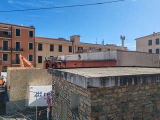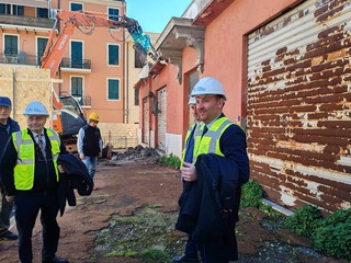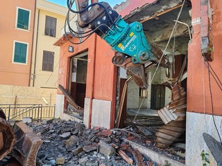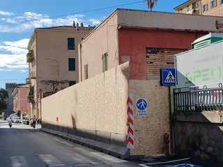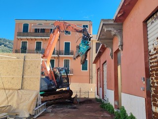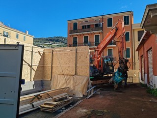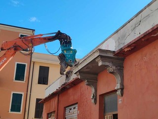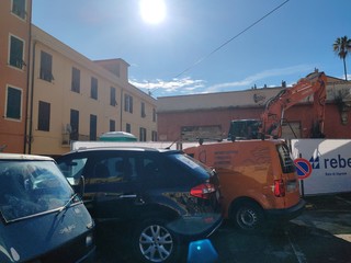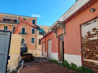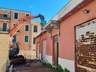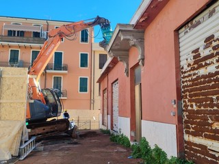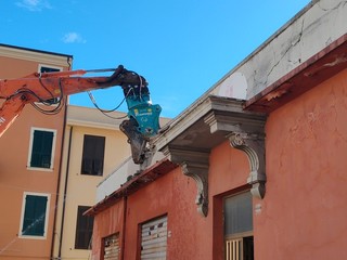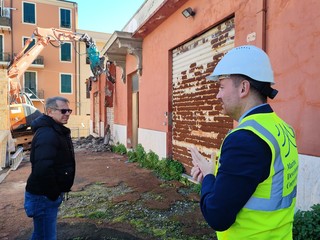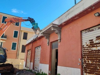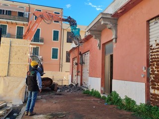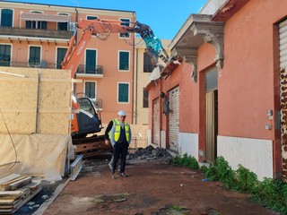 Ruspa in azione al Borgo di Ventimiglia. E' iniziata ufficialmente questa mattina la demolizione dell'ex Aci in piazza Costituente che, dopo la riqualificazione, diventerà un polo commerciale dedicato al food & beverage con prodotti legati al territorio.