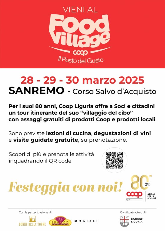 Due appuntamenti proposti da Coop Liguria in occasione dell'80esimo anniversario della cooperativa. Per festeggiare il traguardo in C.so Salvo D'acquisto a Sanremo sarà allestito il Food Village Coop. "Il ritrovo dei partecipanti è previsto al Food Village Coop in corso Salvo D'Acquisto presso lo stand Attività sociali" - sottolineano gli organizzatori - "Da lì si raggiungerà il forte di Santa Tecla con una breve passeggiata. La visita, rivolta a un numero massimo di quaranta persone, durerà circa un'ora e trenta minuti. Dal Food Village Coop partirà anche l'itinerario pomeridiano che sarà un percorso ad anello con un dislivello di 50 mt, perciò non presenta difficoltà. Sono, però, consigliate scarpe confortevoli. La durata della visita, rivolta a un numero massimo di quaranta persone, è di due ore e 30 minuti circa. La prenotazione per entrambi gli eventi è obbligatoria inviando una mail a attivita.sociali@liguria.coop.it indicando nome, cognome, numero di cellulare e visita richiesta. La prenotazione è effettiva solo se confermata via email. E' gradita l'scrizione entro giovedì 27 marzo. Nel pomeriggio di sabato e domenica, se soci Coop, è possibile partecipare anche al test dell'Approvato dai Soci".