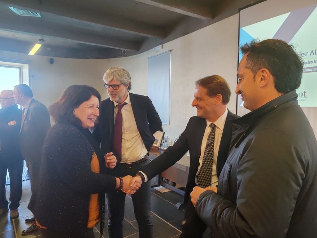 Sono intervenuti anche Laurence Boetti-Forestier, consigliera regionale delegata alle relazioni transfrontaliere Regione Sud e vicepresidente della Mission Opérationnelle Transfrontalière, Raffaele Viaggi della Mission Opérationnelle Transfrontalière, Martina Benedetti Marshall della Mission Opérationnelle Transfrontalière e Sara Smaniotto di Mission Opérationnelle Transfrontalière. Sono stati illustrati il Piter+ e Alpimed+ per Meropole Nice Cote d'Azur, il Piter+ e Paysage+ per la Provincia di Imperia, B-solutions et Resilient Borders sui trasporti e il progetto di Gect. Alla fine dei lavori un light lunch è stato offerto dalla Regione Liguria.