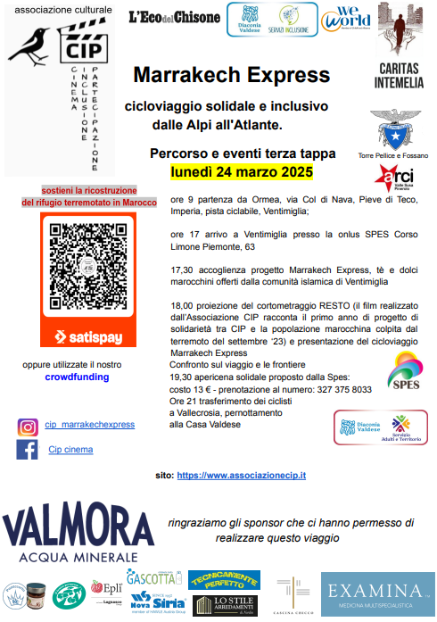All'arrivo a Ventimiglia, previsto lunedì 24 marzo alle 17 presso la onlus SPES in corso Limone Piemonte, verranno proposte diverse attività che sono state organizzate in collaborazione con la Caritas Intemelia, la Diaconia Valdese, We World e l’associazione SPES. I partecipanti di Marrakech Express verranno accolti con tè e dolci marocchini offerti dalla comunità islamica di Ventimiglia. Alle 18 vi sarà una proiezione del cortometraggio "Resto", il film realizzato dall’associazione CIP che racconta il primo anno di progetto di solidarietà tra CIP e la popolazione marocchina colpita dal terremoto del settembre ‘23, e poi si terrà la presentazione del cicloviaggio Marrakech Express con un confronto sul tema viaggio e le frontiere. Infine, alle 19.30, vi sarà un apericena solidale proposto dalla Spes. "Al centro dell'attenzione ci sarà lo sport inteso come pratica inclusiva e capace di andare oltre le barriere sociali, psicologiche e fisiche degli individui" - dicono gli organizzatori - "Vi invitiamo, quindi, ad essere presenti all'arrivo della tappa a Ventimiglia. L'apericena avrà un costo di 13 euro. Si può prenotare al numero 327 375 8033. Per avere, invece, informazioni sul progetto, la sua genesi e sulle numerose tappe del viaggio dal Piemonte al Marocco si può scrivere a cip.associazione@gmail.it o telefonare a Marco Ramotti al 339 8941900".