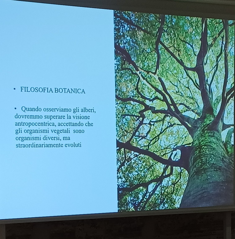 E' stato introdotto il relatore, il botanico e scrittore Claudio Littardi, il quale in modo chiaro e avvincente ha spiegato che: “Gli alberi non muoiono a causa della senescenza geneticamente programmata nei loro meristemi (tessuti), ma piuttosto vengono uccisi da un agente esterno o da un evento di disturbo. Avere 2000 anni non vuol dire essere vecchi dal punto di vista dell’albero. In tutto questo tempo l’organismo originario è già scomparso più volte a causa della sovrapposizione di nuovi strati, come camicie che i germogli pongono in cima a tutta la struttura ma mano che le nuove crescite si succedono alle vecchie. In questo modo, gradualmente, un nuovo strato va schiacciando quelli vecchi: quelli che si trovano nella parte più interna sono morti, pietrificati nel velenoso durame o digeriti da funghi xilofagi”.