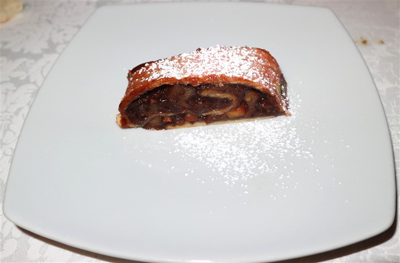Infine, la cena si è chiusa in dolcezza con la Rocciata, un dessert a base di pasta sfoglia farcita con mele e noci, che ha deliziato il palato e concluso la serata in modo perfetto.