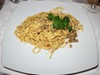 Il primo piatto, Umbricelli con ragù di oca e tartufo, ha stupito per la texture della pasta artigianale unita a un condimento ricco e aromatico, fondendo i gusti della terra con quelli del bosco.
