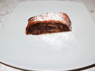 Infine, la cena si è chiusa in dolcezza con la Rocciata, un dessert a base di pasta sfoglia farcita con mele e noci, che ha deliziato il palato e concluso la serata in modo perfetto.