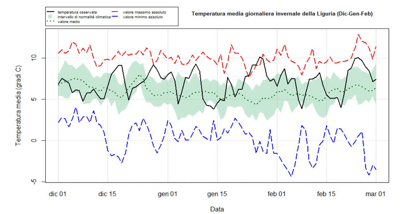 L'inverno 2024-2025 in Liguria si è distinto per un andamento climatico caratterizzato da temperature mediamente miti e precipitazioni distribuite in modo non omogeneo. La provincia di Imperia, secondo quanto riferito dall'Arpal, ha registrato un andamento termico meno estremo rispetto ad altre zone della regione, ma ha comunque risentito delle anomalie generali che hanno interessato tutta la Liguria.