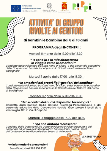 Martedì 1 aprile, presso la Sala Rossa del Palazzo del Parco di Bordighera, dalle 17.00 alle 18.30 si terrà l’incontro “Le emozioni dei propri figli - gestioni del conflitto”; l’appuntamento, rivolto ai genitori di bambini e bambine dai 6 ai 10 anni, verrà condotto dalla psicologa Dottoressa Anna Di Cicco e dal personale educativo della Cooperativa Sociale Jobel.