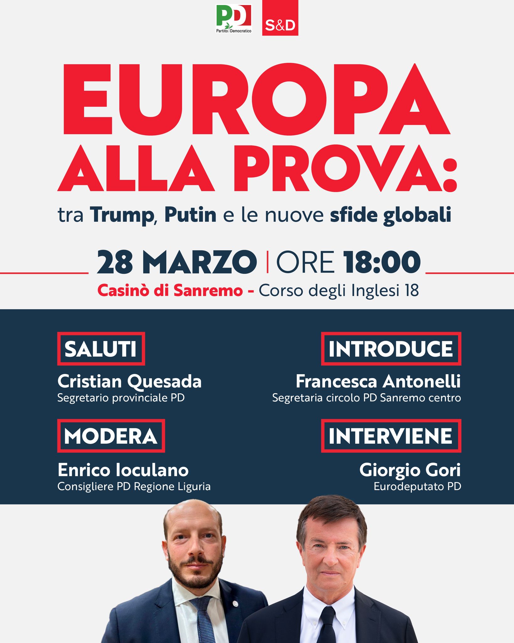 L’appuntamento è per domani pomeriggio alle 18 al Casinò di Sanremo, nato da un’iniziativa del consigliere regionale del PD Enrico Ioculano. Sarà un’occasione di approfondimento e confronto sul ruolo dell’Europa nel nuovo contesto internazionale, sempre più segnato dalle tensioni geopolitiche globali e dalle influenze di Donald Trump, Vladimir Putin e altri attori emergenti.
