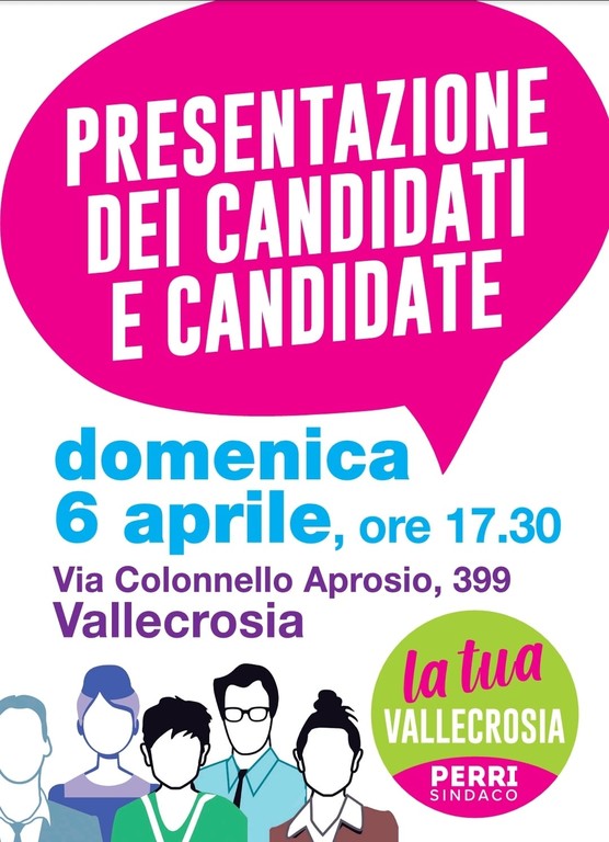 Tutti i candidati nella lista "La tua Vallecrosia Perri Sindaco" verranno presentati ufficialmente domenica 6 aprile alle 17.30 presso il point inaugurato lo scorso 8 marzo in via Colonnello Aprosio 399.