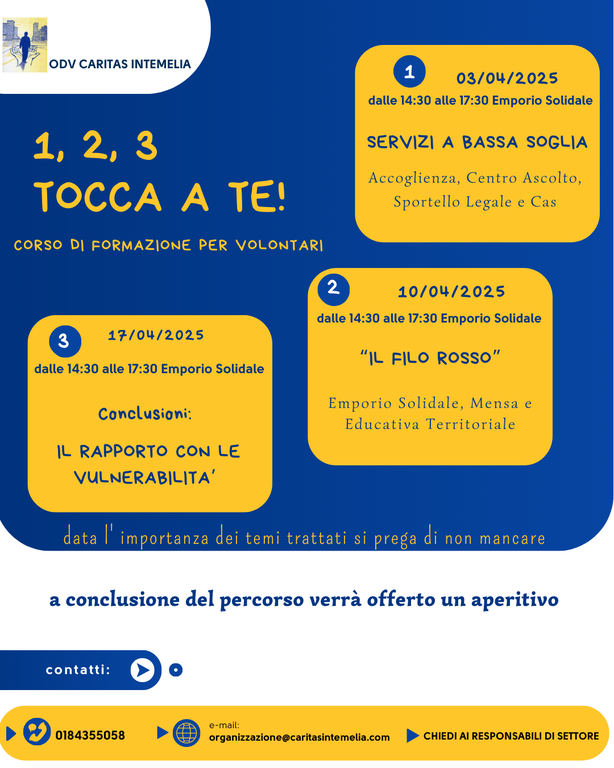 Da giovedì 3 aprile, e per tre giovedì, l'OdV Caritas Intemelia organizza un corso di formazione per i volontari aperto anche a chi volesse diventare volontario. L'incontro si terrò dalle 14.30 alle 17.30 presso l'emporio solidale in via Sottoconvento 86 a Ventimiglia.