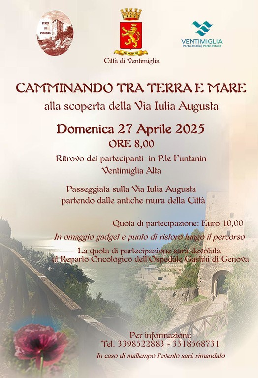 La quota di partecipazione sarà, infatti, devoluta al reparto oncologico dell'ospedale Gaslini di Genova. "Il ritrovo dei partecipanti sarà nel piazzale Funtanin a Ventimiglia Alta" - fanno sapere gli organizzatori - "Faremo una passeggiata sulla via Iulia Augusta partendo dalle antiche mura della città".