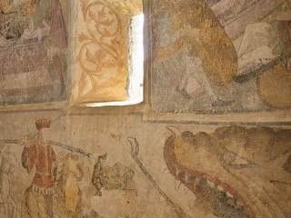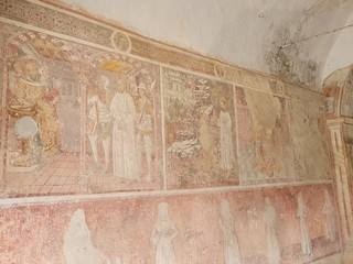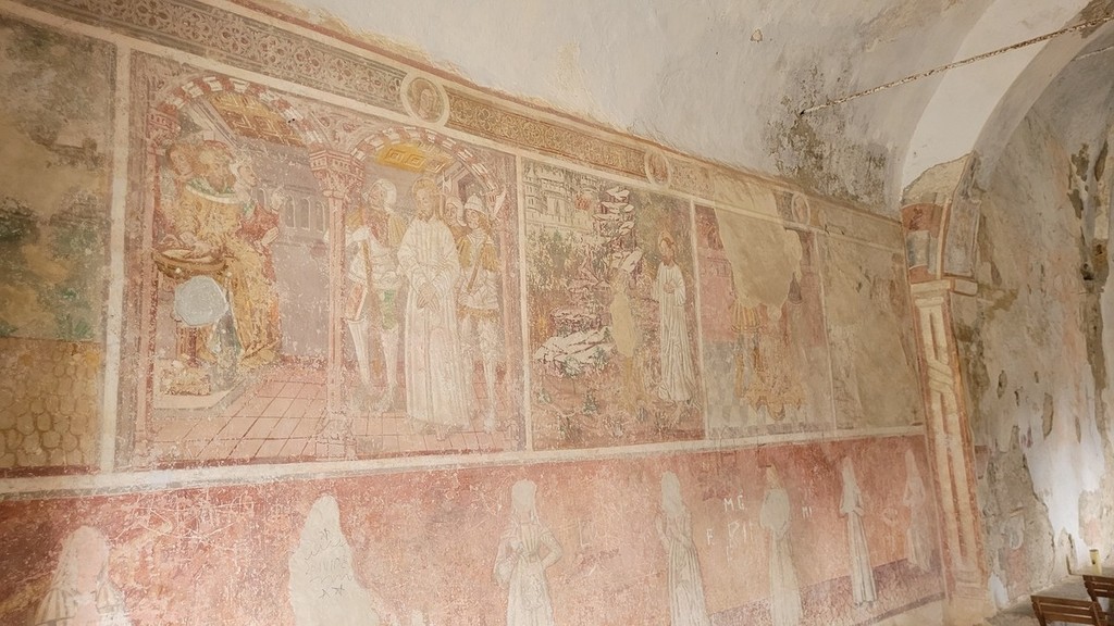 Gli affreschi quattrocenteschi, secondo la poetica del tempo, sono un monito ai pellegrini d'intraprendere la retta via e di seguire i precetti della vita cristiana. Il percorso pittorico è opera di pittori ignoti, di matrice piemontese, che al tempo dipingevano nell'ambito delle Alpi Liguri e Marittime.