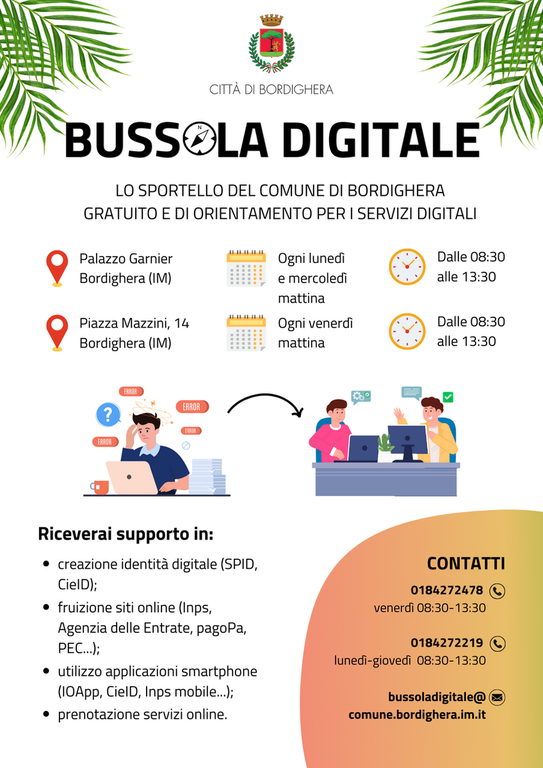 A Bordighera continua l’attività del servizio “Bussola Digitale”: tutti i Cittadini possono avere gratuitamente assistenza nell’utilizzo delle piattaforme online della Pubblica Amministrazione. Gli utenti vengono affiancati, ad esempio, per l’attivazione dello SPID, per i pagamenti tramite PagoPA, per la consultazione di portali pubblici, tra cui quello dell’INPS. Sono inoltre fornite indicazioni per l’utilizzo della Posta Elettronica Certificata (PEC) e per interagire con diversi siti istituzionali.
