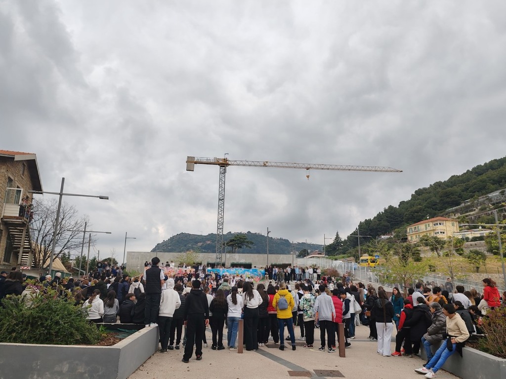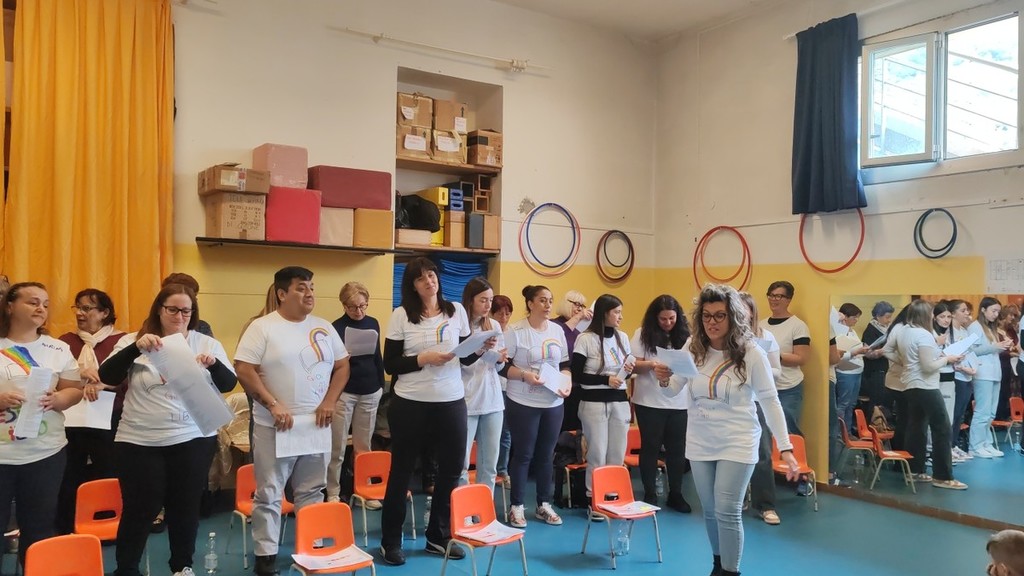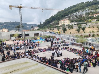 "È una grande emozione oggi, qua, ora, tutti insieme! Cogliamone il valore e viviamolo nelle nostre giornate e diventiamo costruttori di pace, tutti noi, grandi e piccoli. Portiamo questo nelle nostre giornate e adesso sprigioniamo energia bella". Con questa frase ha preso il via, questa mattina, un flash mob nel cortile dell'istituto Andrea Doria a Vallecrosia incentrato sul tema 'Immaginare insieme'. Studenti, docenti, personale scolastico, genitori e nonni hanno animato la scuola con canti, danze e striscioni collegati dal tema "Immagina" in occasione della Giornata mondiale del Libro. Per l'occasione erano presenti anche l'assessore Patrizia Biancheri, la polizia locale, la Protezione civile e la Croce Azzurra Misericordia di Vallecrosia.