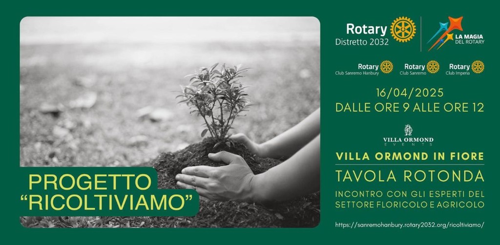 I Rotary Club della Provincia di Imperia, si stanno impegnando nella costituzione di un Team di Persone Esperte in diversi ambiti, con l’obiettivo di stimolare e incoraggiare un nuovo ciclo produttivo della floricoltura locale, che riguardi reciso, il vivaismo, ma anche l’agricoltura in generale. Da questa idea è nato il progetto “Ricoltiviamo”, che prevede una serie di iniziative, tra le quali, l’organizzazione di una Tavola Rotonda aperta al pubblico, rivolta ai giovani, alla quale parteciperanno vari professionisti del settore, che si terrà mercoledi16 aprile dalle ore 9.00 alle ore 12.00 a Villa Ormond, presso la Sala Convegni del piano terra. All’evento parteciperanno oltre cento studenti, accompagnati dai loro docenti, provenienti da corsi ITS dell’Accademia Ligure Agroalimentare, dal Liceo G. D. Cassini, dall’Istituto di Istruzione Superiore "E. Ruffini - D. Aicardi" e dall’Istituto Ruffini di Imperia. L’evento fa parte della manifestazione Villa Ormond in Fiore, che si terrà dal 15 al 17 aprile.