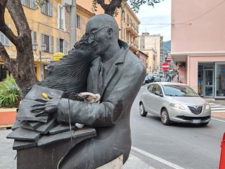 E' iniziato, questa mattina, l'intervento dello scultore per far ritornare com'era il monumento dedicato a Emilio Azaretti, farmacista, cultore di dialetto e tradizioni locali, che studiò e si fece promotore del dialetto e delle tradizioni di Ventimiglia. Nel 1927 fondò la Cumpagnia d’i Ventemigliusi, che presiedette fino al 1945, e promosse numerose pubblicazioni tese a salvare il patrimonio dialettale.