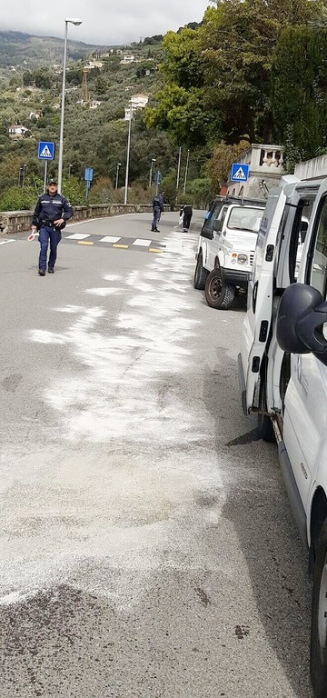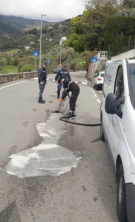 Sanremo, semina olio del cambio dell'auto lungo la via Ariosto: interviene la polizia locale (foto)