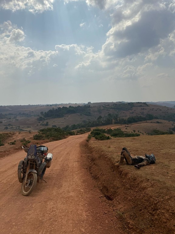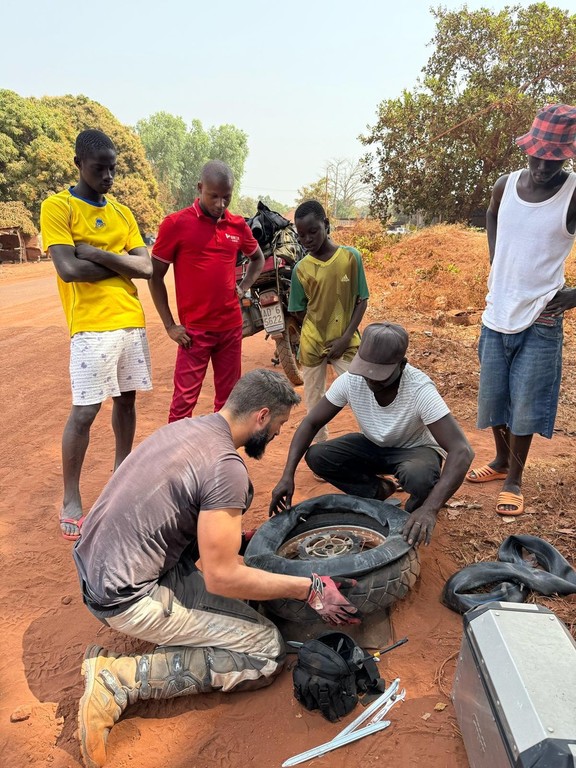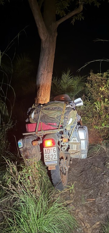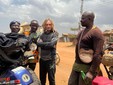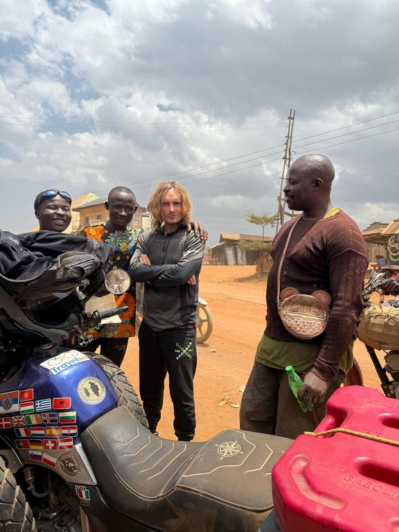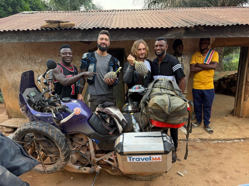 Filippo, grazie alle sue capacità meccaniche, si era chinato sui motori spenti e dopo un po' era riuscito a far ruggire nuovamente le nostre fedeli due ruote. L'uomo ci ha guidati attraverso la notte fino al suo villaggio, un microcosmo di vita semplice e autentica: un grappolo di casupole di fango con tetti di foglie, immerse in un'oscurità punteggiata solo dalla luce tremolante di qualche fuoco. Lì, dove la corrente elettrica era un lusso sconosciuto, siamo stati accolti con una generosità disarmante. Ci hanno offerto della Coca-Cola in mancanza dell'acqua e succosi ananas come ristoro. Dopodiché ci hanno invitato a pernottare nella piazzetta del villaggio. Il mattino seguente, ci siamo congedati dai nostri inaspettati angeli custodi, pronti a riprendere il nostro viaggio. Quello che più ci ha colpito di questo episodio è stata l'ospitalità e la disponibilità che si riscontrano in Africa verso i viaggiatori. Si tratta di una solidarietà profondamente radicata e ineguagliabile in questa gente".