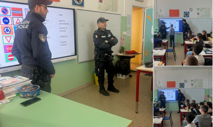 Lezione interattiva e coinvolgente con la polizia locale di Vallecrosia per gli alunni classe quinta della scuola primaria. Gli agenti hanno incontrato gli studenti, accompagnati dalle insegnanti Rita, Barbara, Maria Carmela, Maria Virginia e Simone, per parlare di educazione stradale.