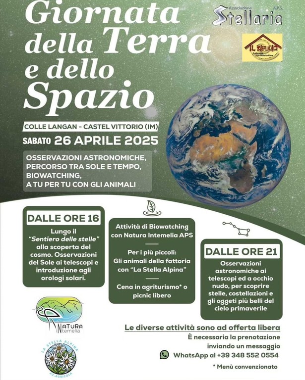 Dalle 16 sono previste osservazioni del Sole ai telescopi e introduzione agli orologi solari lungo il "Sentiero delle stelle" alla scoperta del cosmo. In seguito, vi saranno attività di biowatching con Natura Intemelia Aps. "Chi conosce ama, chi ama tutela. Per poter vivere appieno la giornata mondiale della Terra, non possiamo solo condividere immagini ad effetto sul nostro profilo. Dobbiamo vivere la Terra e celebrare il senso di stupore che ci permette di apprezzarla ed averne rispetto. Per questo motivo, quest'anno saremo con l'associazione Stellaria a Langan, il 26 aprile, per far scoprire a tutti voi l'universo meraviglioso in cui siamo immersi" - fa sapere Natura Intemelia Aps - "Un'esperienza di immersione profonda della natura presso l'agriturismo "il rifugio" colle Langan. Vi aspettiamo alla giornata tra la terra e il cielo".