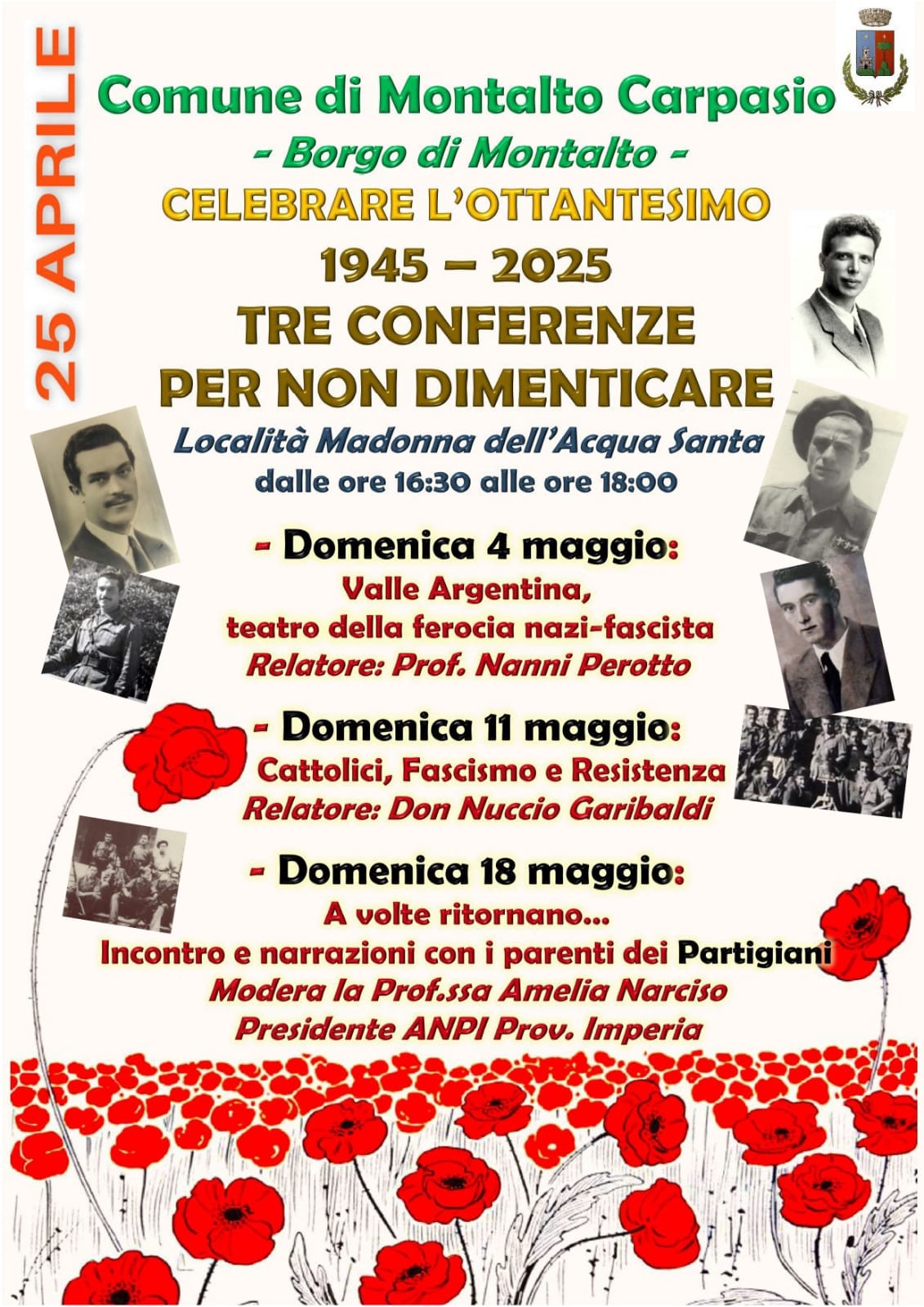 Sempre a Montalto, per celebrare l’80° anniversario della Liberazione, verranno organizzate tre conferenze ‘Per non dimenticare’. Domenica 4 maggio, in località Madonna dell’Acqua Santa si tratterà il tema ‘Valle Argentina, teatro della ferocia nazifascista’, con la relazione del Prof. Nanni Perotto.