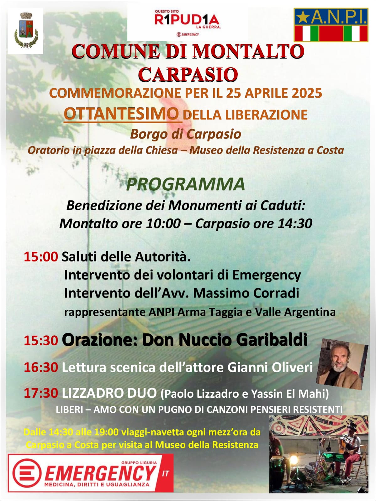 Alle 15 sono previsti, dopo i saluti delle autorità, l’intervento dei volontari di Emergency, dell’avvocato Massimo Corradi e del rappresentante dell’Anpi Arma Taggia e Valle Argentina. Alle 15.30 l’orazione di Don Nuccio Garibaldi, alle 16.30 la lettura scenica dell’attore Gianni Oliveri e, alle 17.30 l’esibizione del Lizzadro Duo.