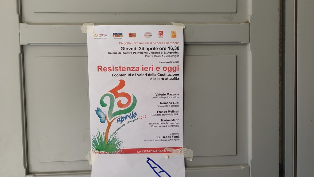 "Resistenza ieri e oggi. I contenuti e i valori della Costituzione e la loro attualità" è stato il tema al centro dell'incontro-dibattito con il professor Vittorio Mazzone che si è svolto ieri pomeriggio nel salone di Sant'Agostino a Ventimiglia. Per l'occasione sono intervenuti anche Franco Molinari del Comitato provinciale Anpi, il giornalista e scrittore Romano Lupi, Marina Marin, presidente della sezione soci Coop Liguria di Ventimiglia, e Giuseppe Famà dell'associazione culturale XXV Aprile che ha coordinato l'evento. Tra il pubblico presente vi erano, inoltre, il consigliere regionale Enrico Ioculano e il consigliere comunale Alessandro Leuzzi.