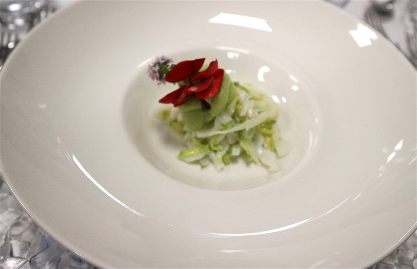 Come antipasto è stata servita un'insalata di seppie cotte a bassa temperatura, delicatamente abbinata all’avocado e ai vivaci fiori di Begonia, portando leggerezza e freschezza al palato.