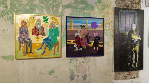 La Personale di Natale Cannelli (Volpiano, TO, 1951) si compone di 16 grandi tele di genere figurativo-surreale (dim 1 mt x 1mt circa) realizzate con tecniche miste (olii, acrilici, matite, gessi, pennarelli, etc). Spiega la Curatrice: “Sono opere storico-simboliche, mitologiche, mistiche o di denuncia. Perfette per un borgo ricco di atmosfere antiche e leggendarie come quelle di Seborga. Si tratta di dipinti che si ispirano all’Asterione, il minotauro borgesiano, alla piccola zingara col palloncino, all'inventore geniale, al rasta africaneggiante. Si va dalle sparute creature contadine ai volti di artiste donne vissute all'ombra di loro amori più grandi, dai paesaggi assolati e ben antropizzati, ai vasi di fiori che citano grandi dipinti della storia dell’arte, in un incastro coloratissimo e vibrante, tra esseri travagliati dalle loro stesse scoperte, infausti destini e predestinate persecuzioni. Eroi e antieroi, demoni e santi. Tutti vittime”.