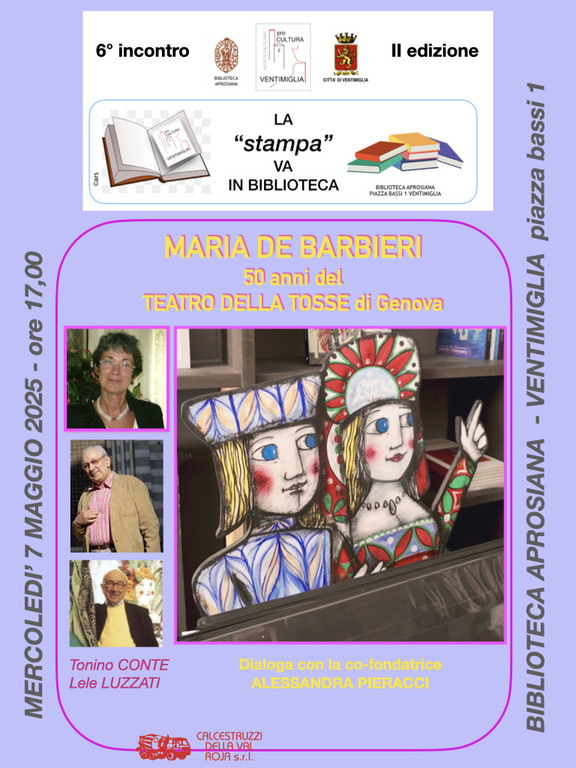 Maria De Barbieri sarà l'ospite del sesto incontro della seconda edizione della rassegna 'La stampa va in biblioteca' in occasione dei 50 anni del Teatro della Tosse di Genova. L'incontro si terrà mercoledì 7 maggio alle 17 presso la biblioteca Aprosiana, in piazza Bassi, a Ventimiglia.