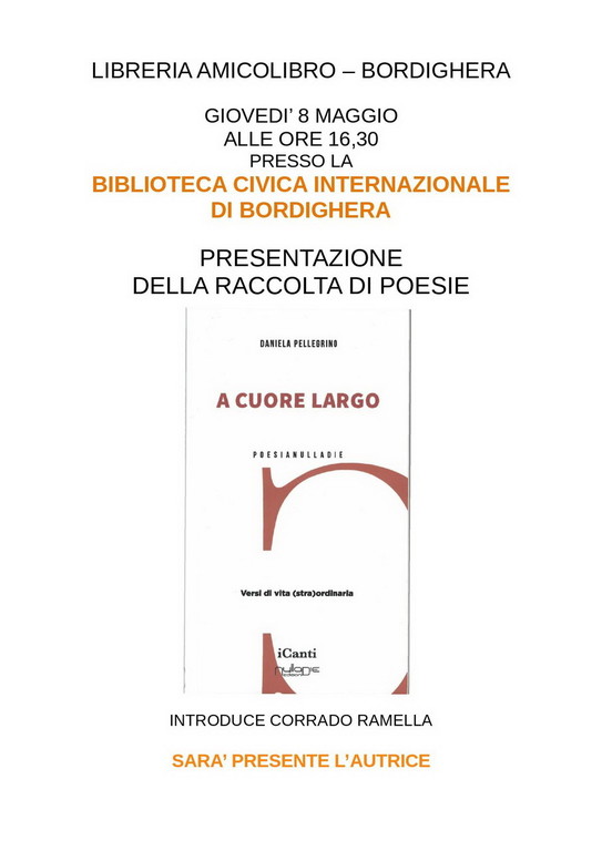 Un nuovo pomeriggio con l’autore alla Biblioteca Civica Internazionale di Bordighera: giovedì 8 maggio alle ore 16.30 Daniela Pellegrino presenterà “A cuore largo” (Nulla Die, 2025), raccolta di poesie che intrecciano emozioni, affetti, ricordi e paesaggi. L’incontro sarà introdotto da Corrado Ramella.