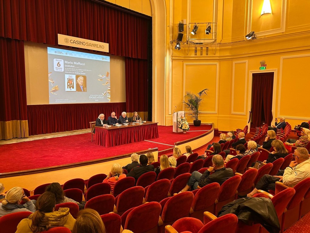 “Bando doveroso e location magica, impossibile pensare il Festival altrove”, parola di Mario Maffucci. Grande partecipazione e interesse questo pomeriggio al Teatro del Casinò di Sanremo per un nuovo appuntamento dei Martedì Letterari, la rassegna culturale curata da Marzia Taruffi. Ospiti dell’incontro, per l'appunto, lo storico dirigente Rai e capo struttura del Festival di Sanremo Mario Maffucci e il giornalista e autore Andrea Scarpa, che hanno presentato il loro libro “Samurai. Le avventure di un Forrest Gump della Tv dietro le quinte del potere” (ed. Fuori Scena).