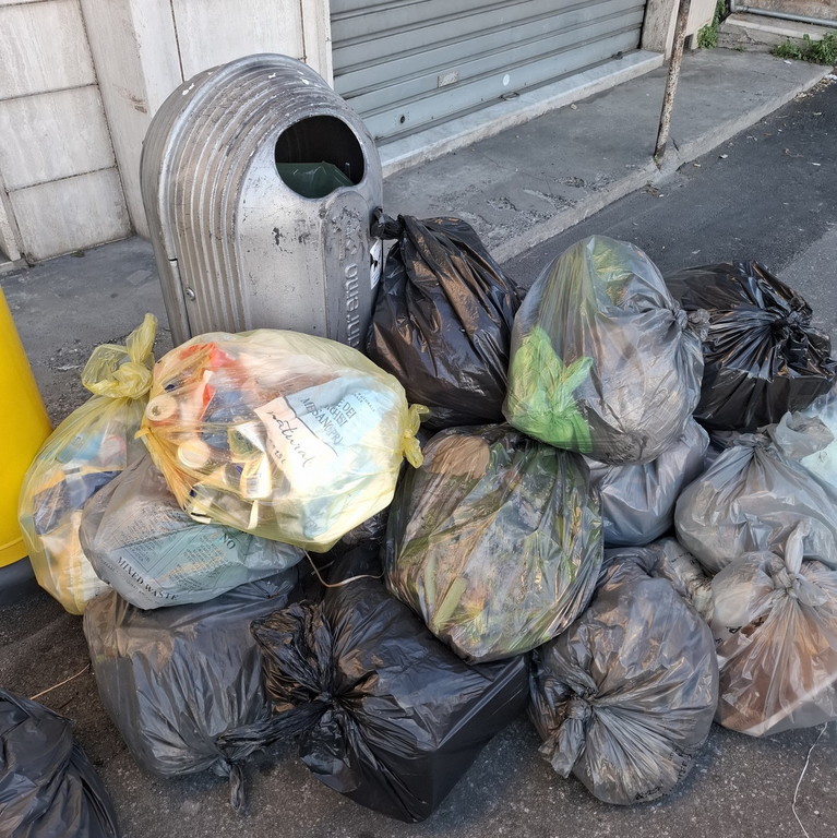 “Ieri era giornata per l’indifferenziata (sacchi grigi) e per il biologico (sacchi piccoli giallo chiaro nei cestelli). Lo spettacolo che si vede di fronte al tabacchino, nella zona della Madonna della Costa è invece quello delle foto che invio. I sacchi grigi per l’indifferenziata (molti) e quelli gialli grandi per la plastica che dovrebbero essere messi il lunedì. Per di più, a vedere in trasparenza, c'è anche del biologico ma nei sacchi sbagliati, c'è plastica ed alluminio quando non è il giorno di raccolta. E nessuna raccolta da parte di Amaie, almeno per chi ha messo nel giorno giusto la spazzatura giusta. Tutto lasciato lì. Come si vede ho fotografato anche il bidone del vetro. Straripante e ovviamente con bottiglie disposte ai suoi piedi. Anche in questo caso nessuna raccolta”.