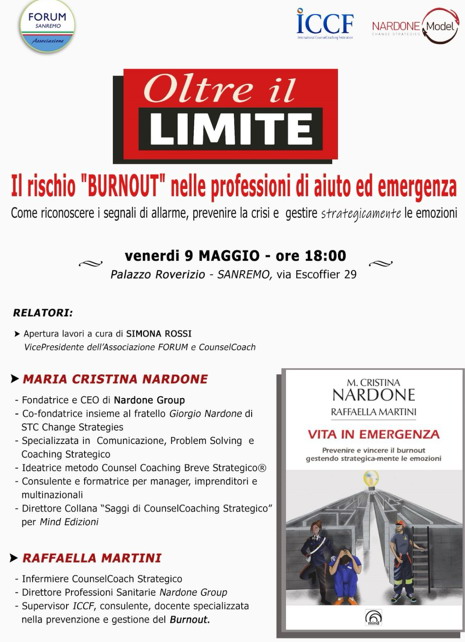 L'associazione culturale Forum Sanremo organizza per domani, venerdì 9 maggio, un incontro dal titolo "Oltre il limite". Si parlerà di Burnout e di gestione strategica delle emozioni. Anche se il tema nasce per chi lavora in contesti d’emergenza, saperlo affrontare è importante per chiunque voglia imparare a riconoscere i segnali e a gestire meglio le proprie energie emotive.