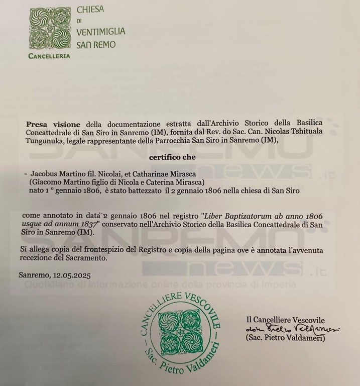 Si tratta di Giacomo Martino, figlio di Nicola e di Caterina Mirasca, nato nella città dei fiori il 1° gennaio 1806 e battezzato il giorno successivo nella chiesa di San Siro. I documenti sono emersi nel registro dei battesimi della stessa chiesa, grazie alla sollecitazione della Famija Sanremasca e con la fattiva collaborazione del Vescovo, Mons. Antonio Suetta e, soprattutto, del parroco della Concattedrale, don Nicolas.