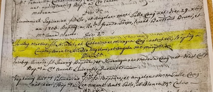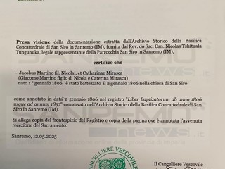 Si tratta di Giacomo Martino, figlio di Nicola e di Caterina Mirasca, nato nella città dei fiori il 1° gennaio 1806 e battezzato il giorno successivo nella chiesa di San Siro. I documenti sono emersi nel registro dei battesimi della stessa chiesa, grazie alla sollecitazione della Famija Sanremasca e con la fattiva collaborazione del Vescovo, Mons. Antonio Suetta e, soprattutto, del parroco della Concattedrale, don Nicolas.